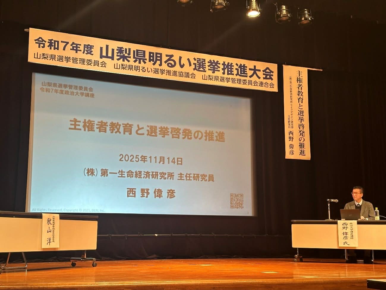 2025年11月14日、令和7年度山梨県明るい選挙推進大会(甲府市)が開催され、「政治大学講座」の講師として登壇しました。
